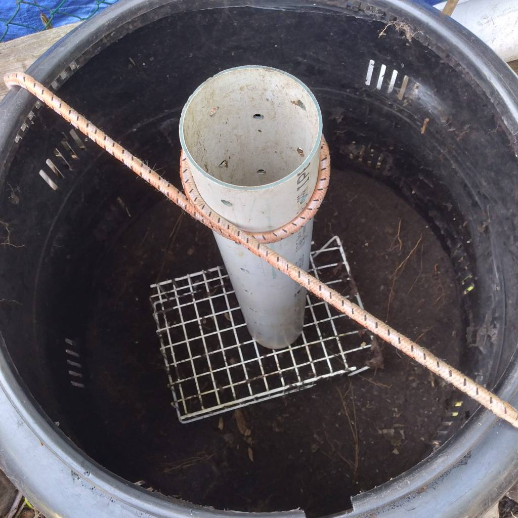 devised a technological hack for backyard composting, adapted from the Johnson-Su process for building fungally-dominant bioreactors: upcycled dish rack found on curbside, inverted to provide for updraft (like the ‘basket’ for wood in a fireplace), with a 4″ perforated PVC pipe on top and bungee cord holding it in place during loading phase….. after a few days the pipe is removed and the dish rack leaves an air pocket at the bottom for updraft and aeration of the pile.