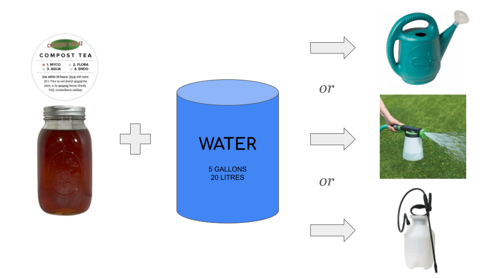 Our compost teas should be diluted 20:1 prior to usage, so a 1L mason jar of Crooked Farmz compost tea makes approximately 20L of ready-to-use product (about a 5-gallon bucket worth).